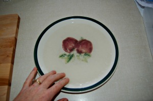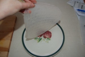 | You might find these a little tricky at first but once you get the hang of it, they may become a go-to favourite. Fill a plate that’s a little bigger than the wrap with hot water from the tap. Don’t use boiling water. Soak the wrap until it’s softened a bit but not flimsy. This is where the trick lies. You’ll feel like it’s still too stiff to roll, but it will continue to soften on the board as you add your filling.