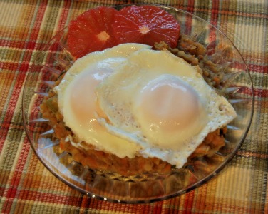 Breakfast: Poached eggs with lentils and bacon (bacon optional) |