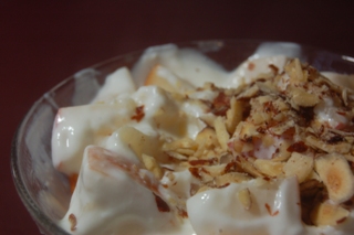 Breakfast: Yogurt, diced fruit topped with nuts and honey or maple syrup |