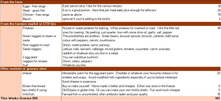 Here is a shopping list for the week for a family of 4. Prices will vary widely depending on your location, but I thought there would be value in estimating just so you can see how meal planning and buying what you need can save a lot rather than impulse shopping at the grocery store.